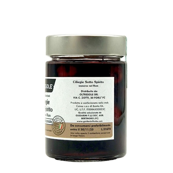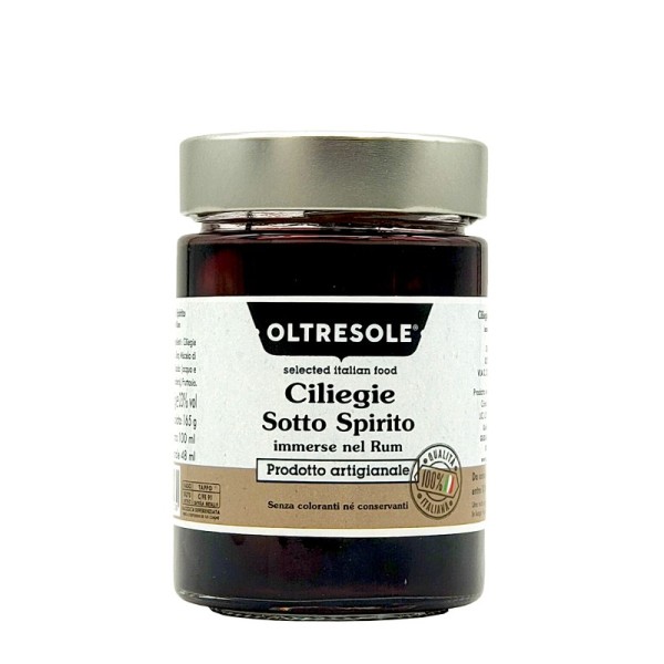 Ciliegie Durone di Romagna, Alcol e zucchero sono gli ingredienti principali utilizzati nella lenta preparazione delle Ciliegie sotto Spirito Oltresole. Realizzate seguendo scrupolosamente l’antica ricetta tradizionale romagnola, le Ciliegie sotto Spirito al Rum, sono ideali per decorare dessert e gelati in tutte le stagioni. Grazie a questo metodo, infatti, le ciliegie si possono conservare per molto tempo, si tratta di un procedimento che si tramanda di generazione in generazione sempre con la stessa modalità. Questa conserva viene preparata utilizzando sole ciliegie Durone: un’antica varietà ben nota in Romagna, che si distingue per i frutti molto grossi, di color rosso-nerastro a polpa soda e croccante, saporitissima ed inconfondibile; successivamente invasate a mano con l’aggiunta della grappa e lasciate riposare per diversi mesi. Succose, sono ottime anche da degustare al naturale, semplicemente aprendo il vasetto come dessert. Ovviamente il liquore non serve solo per conservare e aromatizzare le ciliegie: a sua volta ne viene aromatizzato. Può quindi essere utilizzato come digestivo di fine pasto, servito fresco di frigo.