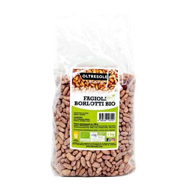I fagioli borlotti Oltresole sono prodotti da coltivazione biologica controllata. Questi fagioli, infatti, vengono selezionati in base ad altissimi standard qualitativi per offrire al consumatore un alimento sano, nutriente e genuino. I fagioli borlotti sono un alimento molto usato nella cucina tradizionale italiana e si caratterizzano per il colore bruno chiaro con venature rosse e il sapore deciso e persistente. Questi legumi mantengono molto bene la cottura e quindi possono essere impiegati non soltanto nelle zuppe e nelle minestre, ma utilizzati anche come contorno o nelle insalate. Sono un alimento molto proteico, quindi sono ottimi per un pasto completo che vi garantisce la giusta dose di energia, inoltre sono ricchi di diverse sostanze nutritive: fibre, vitamine del gruppo B e sali minerali (potassio, fosforo, magnesio, calcio e ferro). I fagioli borlotti Oltresole secchi, prima di essere cucinati, devono essere sciacquati con cura per eliminare eventuali impurità e in seguito lasciati in ammollo per almeno 12 ore. Essendo un legume molto versatile, i fagioli possono essere i protagonisti delle vostre vellutate o zuppe o utilizzati per preparare ricette vegane.
