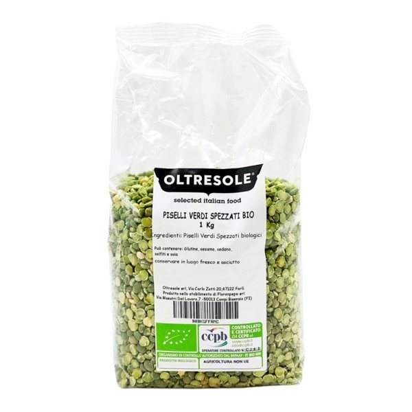 I piselli verdi Biologici Oltresole si presentano come dei legumi spezzati, decorticati e dotati di una forma sferica. A differenza dei classici piselli, questi sono privi di buccia e ciò li rende molto più digeribili, leggeri e ideali per le diete ipocaloriche in quanto hanno un basso contenuto di grassi e di amido. Inoltre, si presentano ricchi di proteine e di sali minerali come per esempio potassio e fosforo. Oltre alle proteine e sali minerali, i piselli verdi spezzati biologici Oltresole, sono ricchi di fibre, quindi vi donano il giusto apporto energetico. Essendo decorticati, i piselli verdi, possono essere subito cotti e non necessitano, come altri legumi dell'ammollo. Dal punto di vista culinario, i piselli verdi spezzati biologici Oltresole, si presentano utili per la preparazione di deliziose ricette come vellutate, zuppe, minestre, risotti ma anche hummus e burger. I piselli verdi, previa cottura, si caratterizzano per il gusto delicato e dolce, quindi perfetti per arricchire primi o secondi piatti.