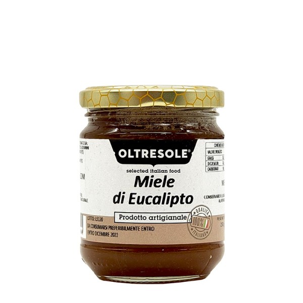 Il Miele di Eucalipto Oltresole è un prodotto artigianale italiano. La consistenza di questo miele è compatta e il colore è ambrato che vira verso il grigio con consistenza ancora più compatta. La sua cristallizzazione avviene in pochi mesi e la granulometria è assai fine. Il sapore è forte, intenso e particolarmente balsamico: per alcuni ricorda i funghi, il legno e il curry, mentre altri vi sentono il sapore dell'elicriso e delle caramelle alla liquerizia. Il gusto comunque non è troppo dolce e anche l’acidità è moderata. Il miele di eucalipto viene utilizzato principalmente contro la tosse e per contrastare i comuni malanni da raffreddamento. Con il suo particolare e speziato sapore è perfetto per accompagnare formaggi molto stagionati come il Parmigiano Reggiano o il Grana Padano, per rendere più goloso lo Yogurt e per addolcire il Tè.