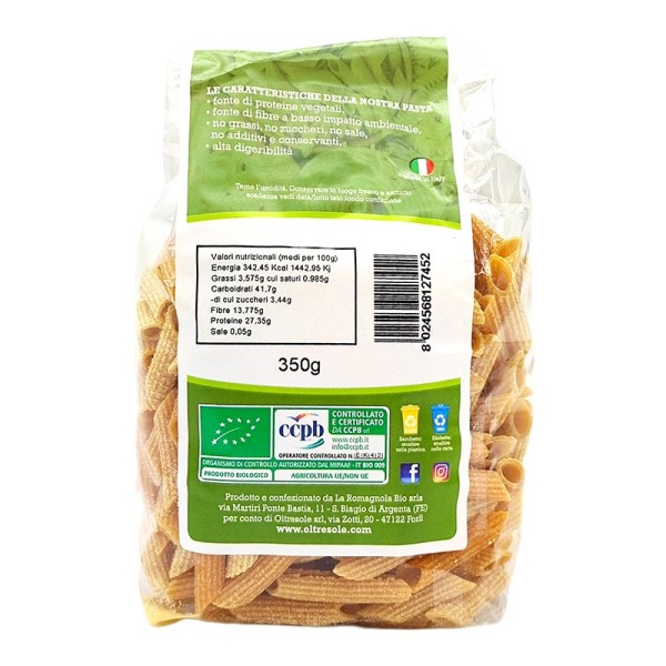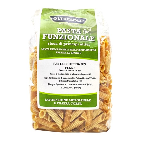 Le penne biologiche con semola di grano duro e farina di lupino Oltresole sono un ottimo sostitutivo della pasta preparata con farine tradizionali, per chi desidera integrare nel proprio regime alimentare il giusto apporto di legumi. La pasta Oltresole a base di farina di lupino è stata pensata per gli sportivi, per donare la giusta quantità di energia e proteine. La linea di “paste funzionali” Oltresole è infatti l'ideale per gli sportivi che non vogliono rinunciare alla pasta. Le penne biologiche sono prodotte con lupino coltivato in Italia e realizzata con metodi tradizionali: lenta essiccatura a bassa temperatura e trafila al bronzo. La pasta proteica con farina di lupino è ricca di vitamine A, B, C, omega 3 e omega 6 e di vari minerali come zinco, calcio, ferro, potassio e manganese, l’alimento ideale per un pranzo equilibrato e sano. Le penne Oltresole sono prive di sale, zuccheri, conservanti e additivi. Questa pasta BIO si caratterizza per l’alta digeribilità e la leggerezza, quindi può essere consumata dagli sportivi prima dell’allenamento. Le penne funzionali sono ottime da gustare con condimenti a base di verdure, ragù di seitan o da consumare fredda come contorno o insalata.