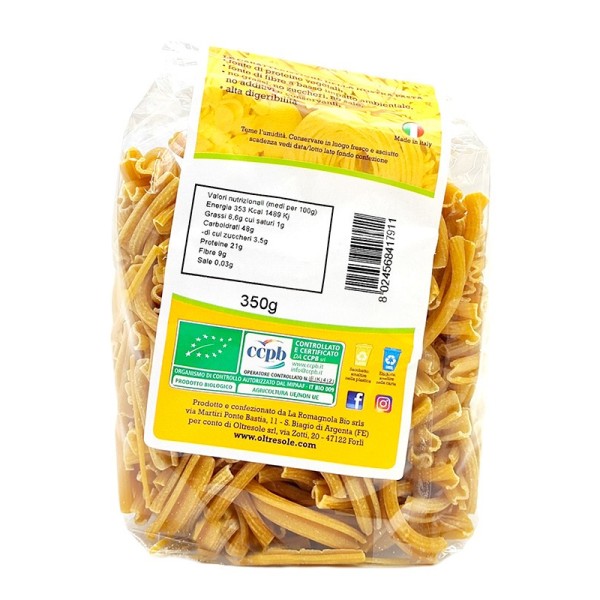 Con la sua ottima digeribilità, la farina di ceci dà vita alle penne di Ceci Oltresole: una pasta artigianale 100% italiana da coltivazioni biologiche, garanzia di alta qualità e assoluta genuinità della materia prima. Si tratta di un alimento dalle innumerevoli virtù: altamente proteica e gluten free, è indicata per l'alimentazione dei celiaci e di quanti seguono un regime alimentare ipocalorico. Le penne di ceci biologici sono lavorati artigianalmente con trafila al bronzo ed essiccatura lenta a bassa temperatura, per mantenere inalterate le proprietà organolettiche e preservare la loro consistenza ruvida. La farina di ceci è un alimento molto energetico e contiene molte fibre, vitamine del gruppo B (B1, B2, B3, B5, B6) e dei gruppi C ed E e alcuni sali minerali come il ferro, il calcio e il fosforo. La pasta Oltresole non contiene additivi, conservanti, zuccheri aggiunti e sale e si caratterizza per un sapore ricco e deciso. Questa pasta artigianale biologica priva di glutine può essere integrata anche nelle diete vegetariane e vegane. La sfiziosa forma di questa pasta corta trattiene perfettamente i condimenti e il suo sapore delicato sposa egregiamente la ricchezza del pesto e della salsa di noci e la leggerezza dei sughi di verdure.
