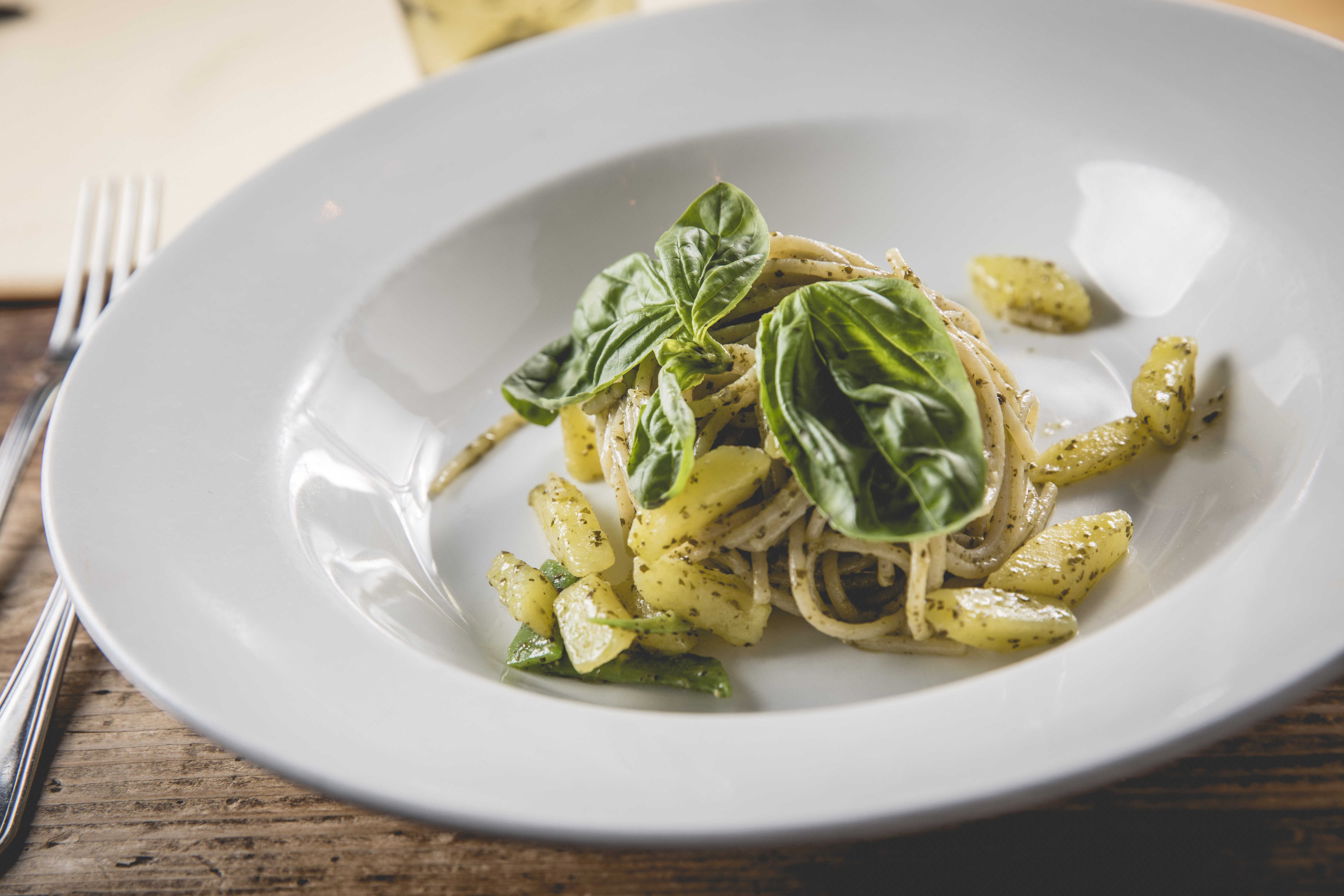 Spaghetti Senatore Cappelli con taccole, patate e pesto al basilico e pinoli