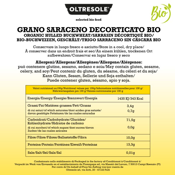 Detto anche grano nero, il grano saraceno crudo Oltresole è una pianta erbacea appartenente alla famiglia delle Poligonacee. È spesso classificato come cereale, sebbene non appartenga alla famiglia delle Graminacee. Il grano saraceno crudo decorticato è naturalmente privo di glutine. I semi del grano saraceno bio sono altamente proteici e contengono vitamine e sali minerali, specialmente vitamine del gruppo B, ferro, selenio, potassio fosforo, rame e zinco. Il grano saraceno crudo bio Oltresole è ideale per cucinare minestre e zuppe con verdure, ma può essere utilizzato anche nella preparazione di paste particolari, come i pizzoccheri, o la polenta taragna. Con il grano saraceno crudo è anche possibile preparare dell’ottimo pane, perfetto per chi ama i sapori particolari. I semi di grano saraceno decorticato non hanno bisogno di ammollo, basterà sciacquarli sotto l’acqua corrente e cuocerli in una pentola con acqua salata (proporzione: 1 parte di grano e 2 di acqua) per 20-30 minuti, fino a che l’acqua non si sarà assorbita completamente.
