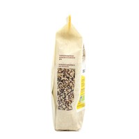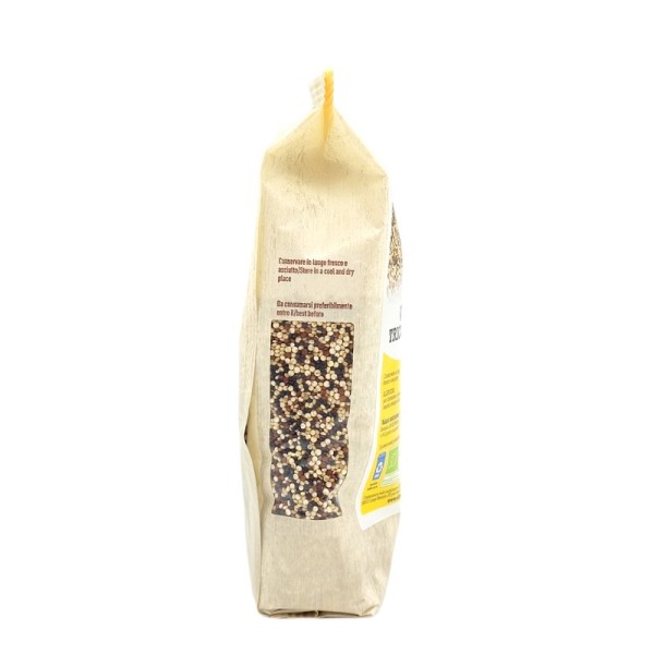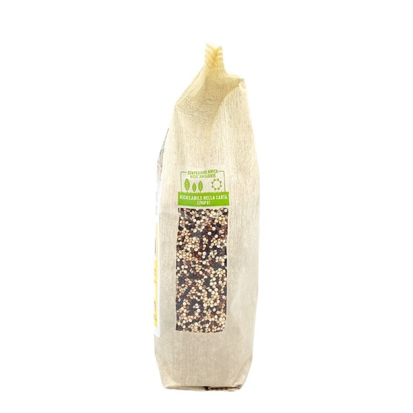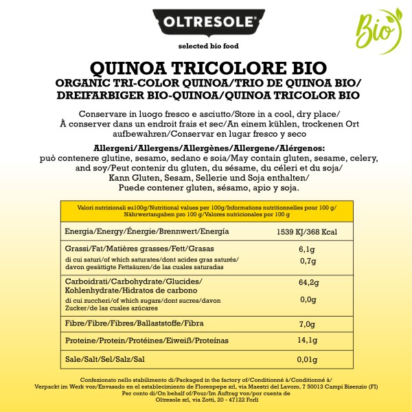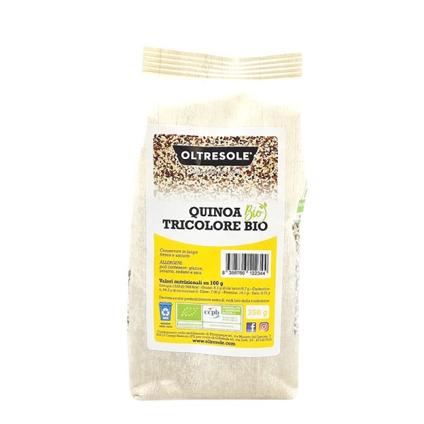 Pur avendo l’aspetto di un cereale, la quinoa non appartiene alla famiglia delle graminacee, ma è il seme di una pianta simile agli spinaci. La quinoa tricolore, proveniente da coltivazione biologica, dell'azienda Oltresole è un mix di semi di quinoa, bianca, rossa e nera. La quinoa bianca ha un sapore neutro, mentre la varietà rossa o nera, si caratterizzano per il sapore più deciso e intenso, donando a questo mix il giusto equilibrio di gusto ed energia. La quinoa, naturalmente priva di glutine è indicata per chi ne è intollerante o per chi segue diete vegan o vegetariane. Questo alimento è ricco di diverse sostanze nutritive, utili per il benessere dell'organismo: fibre, sali minerali (magnesio, potassio e ferro), acidi grassi Omega 3 e 6. Prima di essere cucinata, la quinoa gluten free deve essere sempre sciacquata sotto l'acqua corrente e successivamente cotta per 10-12 minuti, in seguito tostare i chicchi per renderla ancora più gustosa. Può essere utilizzata per preparare sfiziosi antipasti, primi leggeri o gustose minestre a base di verdure. Il mix tricolore Oltresole è anche un’ottima base per realizzare burger o polpette vegane o insalate fresche e genuine.