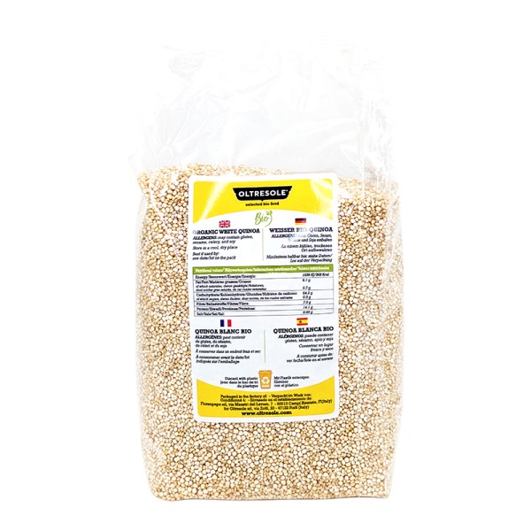 La quinoa è una pianta erbacea originaria del Sud America, molto utilizzata anche in Italia spesso come sostitutivo del riso. La quinoa Oltresole, proviene da coltivazioni biologiche, ed è disponibile nella varietà bianca. La quinoa si caratterizza per un alto valore proteico e un basso contenuto di grassi, l'alimento perfetto da integrare nelle diete ipocaloriche, vegane e vegetariane. La quinoa bio Oltresole è ricca di sostanze nutritive: fibre, vitamina C ed E, sali minerali come magnesio, potassio e ferro e acidi grassi omega 3 e 6. La quinoa bianca, rispetto a quella rossa o nera, ha un sapore più neutro, adattandosi a diverse preparazioni. Prima di utilizzare la quinoa bio Oltresole si consiglia di sciacquare i chicchi sotto l’acqua e poi bollire per circa 10-12 minuti. Per rendere la quinoa gustosa, è importante tostare i chicchi prima di aggiungere il liquido di cottura. La quinoa bio Oltresole è ottima come sostitutiva del risotto o può diventare l'ingrediente principale delle vostre insalate. La quinoa si abbina perfettamente ai condimenti a base di verdure crude o cotte, ma può essere anche gustata al naturale.