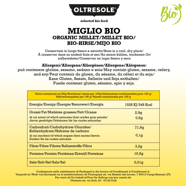 Oltresole nella sua linea di cereali propone anche il Miglio Biologico, cereale protagonista di una recente riscoperta grazie alle sue interessanti proprietà nutritive. Il miglio è infatti un cereale, molto piccolo e rotondo, di colore giallo, un tempo diffusissimo, soprattutto nelle alimentazioni più povere. Oggi caduto in disuso e sostituito dalla carne. Il suo nome botanico è panicum miliaceum, appartiene alla famiglia delle Graminacee, ed è originario dell’Oriente. Nell’antico Egitto, in epoca romana e nel Medioevo, costituiva uno degli alimenti base della dieta perché è una ricca fonte di carboidrati e di proteine. Oggi è diffuso per lo più in Africa, mentre in Occidente è perlopiù conosciuto come mangime per uccelli. Il miglio è un cereale con molteplici proprietà e che dona molti benefici: è ricco di sostante minerali come ferro, magnesio, fosforo e silicio. Svolge un’azione rinforzante su unghie e capelli e sostiene la salute di ossa e smalto dentario. Viene consigliato e utilizzato per chi soffre di disturbi allo stomaco, all’apparato digerente in generale. Preparare il miglio è molto semplice, si può cucinare come cucineremmo un piatto di pasta. Si porta a bollore l’acqua, si aggiunge la quantità di miglio desiderato e si lascia bollire per il tempo necessario, che solitamente non supera mai i 15-20 minuti.
