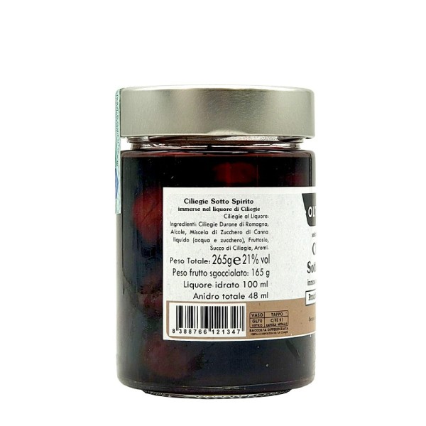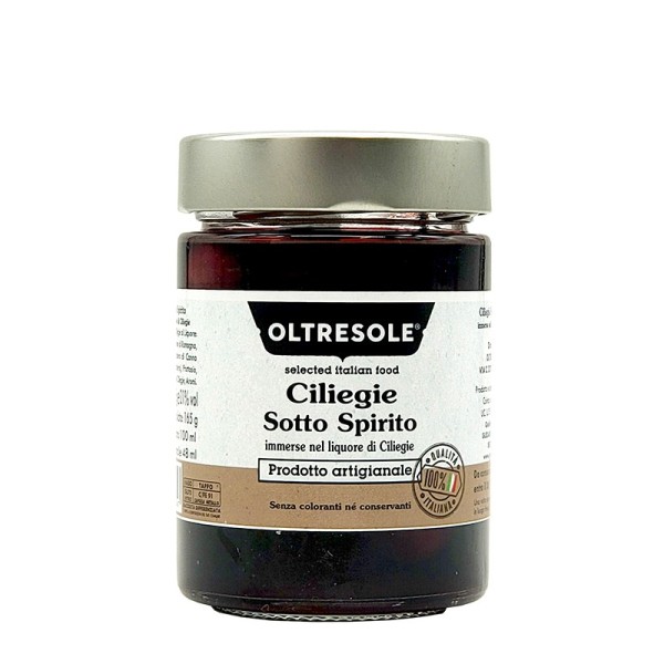 Ciliegie Durone di Romagna, Alcol e zucchero sono gli ingredienti principali utilizzati nella lenta preparazione delle Ciliegie sotto Spirito Oltresole. Realizzate seguendo scrupolosamente l’antica ricetta tradizionale romagnola, le Ciliegie sotto Spirito al Liquore di Ciliegia, sono ideali per decorare dessert e gelati in tutte le stagioni. Grazie a questo metodo, infatti, le ciliegie si possono conservare per molto tempo, si tratta di un procedimento che si tramanda di generazione in generazione sempre con la stessa modalità. Questa conserva viene preparata utilizzando sole ciliegie Durone: un’antica varietà ben nota in Romagna, che si distingue per i frutti molto grossi, di color rosso-nerastro a polpa soda e croccante, saporitissima ed inconfondibile; successivamente invasate a mano con l’aggiunta della grappa e lasciate riposare per diversi mesi. Succose, sono ottime anche da degustare al naturale, semplicemente aprendo il vasetto come dessert. Ovviamente il liquore non serve solo per conservare e aromatizzare le ciliegie: a sua volta ne viene aromatizzato. Può quindi essere utilizzato come digestivo di fine pasto, servito fresco di frigo.
