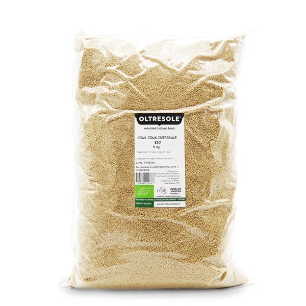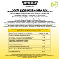 Il cuscus integrale biologico Oltresole (o con grafia francese "couscous") è un alimento tipico del Nordafrica, e, in Italia, della Sicilia occidentale e della Sardegna sudoccidentale. Il suo nome significa “tritato (o ridotto) in minutissimi pezzi”: questo perché si presenta in piccoli granelli di semola di grano duro integrale lavorata con acqua e da cuocere al vapore. Rispetto al grano tenero (Triticum aestivum), il chicco si presenta più allungato, traslucido e, come suggerisce il nome, “duro”. Solitamente esso accompagna carni in umido e/o verdure bollite. Può essere reso piccante accompagnandolo con la harissa (usata soprattutto in Tunisia). In Italia, invece, il cuscus è preparato nel trapanese, in Sicilia; è cotto a vapore in una speciale pentola di terracotta smaltata, ma il condimento, a differenza di quello magrebino, è un brodo di zuppa di pesce.