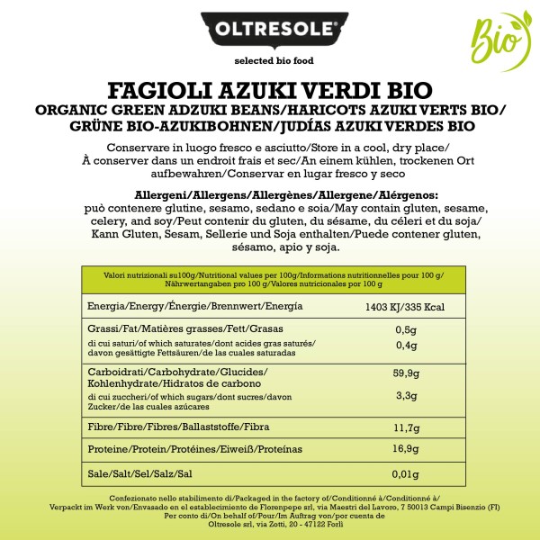 I fagioli Azuki verdi BIO Oltresole, denominati fagioli giapponesi, rappresentano una soluzione differente ai classici fagioli secchi in quanto sono dotati di importanti valori nutrizionali essenziali per il nostro organismo. Infatti, come in tutti i legumi, anche i fagioli azuki, sono ricchi di vitamine del gruppo B, di fibre insolubili e di sali minerali: magnesio, ferro, calcio e potassio. I fagioli biologici azuki di Oltresole sono venduti nella varietà verde, si contraddistinugono dalla forma piccola e un'ottima tenuta in cottura. Questi legumi, essendo secchi, necessitano di ammollo per alcune ore prima della cottura, per renderli più morbidi per le vostre ricette. I fagioli verdi azuki, di origine asiatica, sono indicati per i vegani, i vegetariani e per chi segue un regime alimentare ipocalorico, vista che sono poveri di grassi. Dal punto di vista culinario, i fagioli verdi azuki biologici Oltresole possono essere consumati per la preparazione di zuppe guarnite con foglie di alloro, minestre da gustare insieme a dei crostini integrali, pasta, risotti, polpette e se possibile anche hamburger vegetariani.