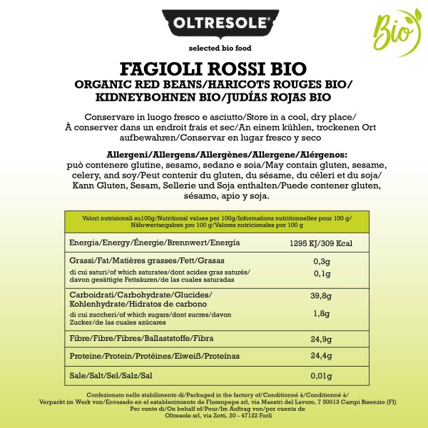 I fagioli rossi di Oltresole sono provenienti da coltivazioni selezionate e certificate Biologiche. Il sapore dolce ricorda quello delle castagne e delle patate dolci. Questa varietà di legume è ricca di fibre e proteine ed è povero di acqua e grassi. Ottimi per preparare alcune gustose pietanze, i fagioli rossi sono ammessi nelle diete ipocaloriche e svolgono un ruolo importante per le diete vegetariane e vegane. I fagioli secchi bio Oltresole sono coltivati senza l'aggiunta di conservanti e additivi, per non alterare il gusto delicato e le loro proprietà organolettiche. Essendo un legume secco, il processo di cottura sarà più lungo: mettere in ammollo per qualche ora, sciacquare accuratamente per eliminare le impurità e cuocere fino a quando i fagioli non saranno abbastanza morbidi. I fagioli rossi Oltresole possono essere cucinati in tantissimi modi: freddi nei contorni e nelle insalate, con l'aggiunta di sale e un filo di olio evo. Il loro sapore dolce ma intenso li rende l'ingrediente ideale per minestroni e vellutate di legumi.