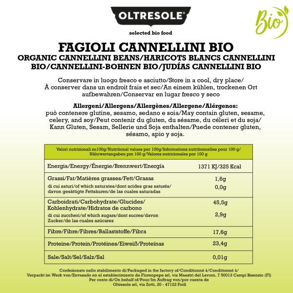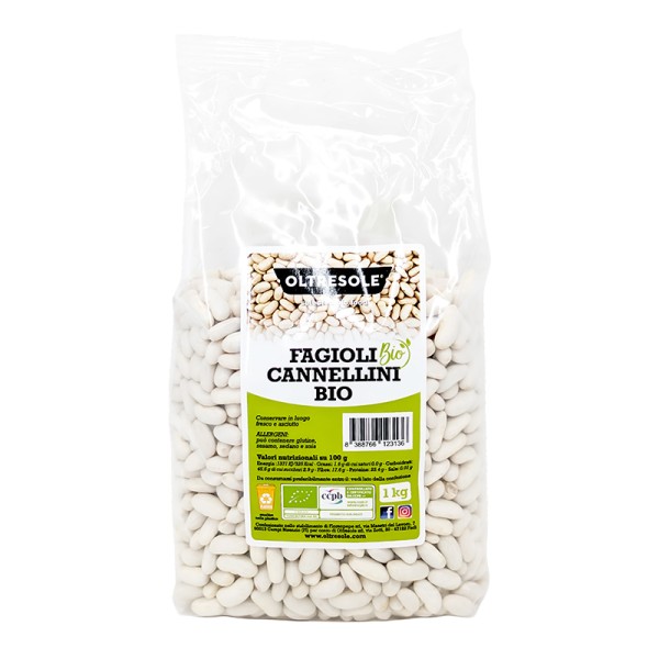 I fagioli cannellini secchi biologici Oltresole si presentano come un'ottima fonte di proteine e di energia ideali per una corretta alimentazione. Ricchi di carboidrati e dotati di un basso contenuto di grassi, garantiscono un corretto apporto di energia all'intero organismo. I fagioli cannellini Oltresole sono selezionati in base ad altissimi standard qualitativi, per offrire un prodotto genuino e controllato. Questi fagioli secchi si contraddistinguono per il colore bianco perla e appena cotti sprigionano tutta la loro fragranza. Questi legumi, dall'elevato apporto proteico, sono un'ottima fonte di vitamine, ad esempio la B1, B2 e B3, di sali minerali, come calcio, fosforo, ferro e zinco. Dal punto di vista culinario, è possibile utilizzare i fagioli cannellini secchi biologici Oltresole per preparare delle zuppe con crostini integrali, vellutate o semplicemente dei contorni come insalata di cannellini o cannellini all'uccelletto.
