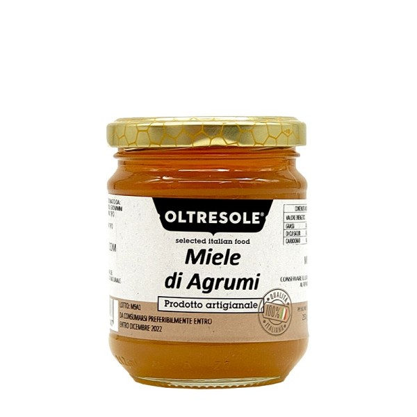 Il Miele di Agrumi Oltresole è un prodotto artigianale italiano. Il miele di agrumi viene ricavato dal nettare raccolto dai fiori delle piante che fanno parte del genere Citrus. A esso appartengono l’arancio, il limone, il mandarino, il bergamotto, il cedro e il pompelmo. Appena prodotto, quando si presenta ancora allo stato liquido, il miele di agrumi ha un colore molto chiaro, assumendo tonalità che vanno dal trasparente al giallo paglierino. Dopo la cristallizzazione, invece, tende al bianco o al beige chiaro. Questo processo, del tutto naturale e spontaneo, permette la formazione di cristalli di dimensioni varie in base alle condizioni di conservazione. A livello olfattivo, presenta il caratteristico profumo floreale che ricorda i fiori da cui viene prodotto, ma che si attenua con il passare del tempo, virando verso note più fruttate. Il gusto, molto dolce, con una gradevole punta acidula, ripercorre le caratteristiche del suo tipico profumo; ciò lo rende molto gradito ai palati e per tal motivo viene spesso utilizzato per la preparazione di pietanze salate, come gli arrosti, e dolci, soprattutto fritti.