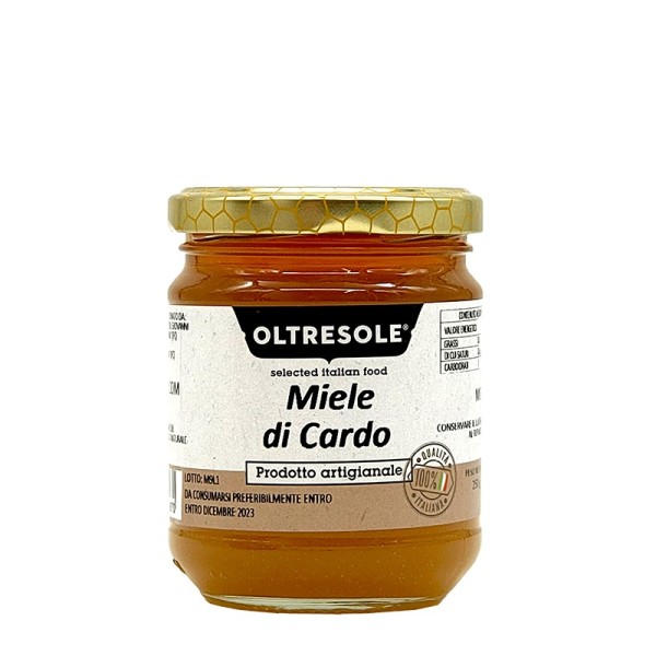 Il Miele di Cardo Oltresole è un prodotto artigianale italiano. Le proprietà organolettiche del nettare di cardo conferiscono al miele aroma e sapore deciso caratteristico: dolce con sentori floreali e retrogusto leggermente astringente. Il colore ambrato chiaro acquisisce sfumature chiare opalescenti con la naturale cristallizzazione a temperature più basse. È straordinario nel dolcificare il thè bianco e verde che ne esaltano l’aroma floreale-fruttato. Ottimo l’abbinamento con i formaggi spalmabili più delicati ai quali dona carattere. Come tutti i mieli è rinvigorente, antiossidante, antisettico, antibatterico, cicatrizzante e alcalinizzante: quindi rispetto allo zucchero non favorisce la carie e facilita la fissazione dei sali minerali nell’organismo umano. In più il miele di cardo ha proprietà digestive, stimola e disintossica il fegato, migliora la circolazione ed è un blando vasocostrittore.