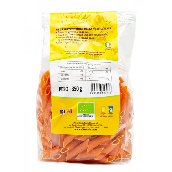 Le penne di lenticchie rosse Oltresole, gluten free, sono prodotte utilizzando esclusivamente materie prime biologiche. Una pasta corta dal colore arancione intenso, che conserva tutti i benefici e le qualità organolettiche grazie all'essiccazione lenta, condotta a bassa temperatura. Ricchi di proteine e di carboidrati questi legumi si caratterizzano per il sapore delicato e l’alta digeribilità, ideali per una dieta sana e bilanciata. Rilevante è anche la presenza di vitamine del gruppo B, di vitamina C, di antiossidanti e sali minerali come il magnesio, il potassio e il calcio. Una pasta artigianale, formulata appositamente per chi soffre di celiachia, ma anche per chi segue un regime alimentare specifico come i vegetariani e i vegani, che non vogliono rinunciare a un prelibato piatto di pasta. La pasta Oltresole non contiene additivi, conservanti, sale o zuccheri aggiunti per non alterare il sapore. La consistenza porosa, realizzata grazie alla trafilatura al bronzo e il sapore ricco e avvolgente, rende le penne di lenticchie perfetti per abbinamenti con sughi a base di verdure fresche.