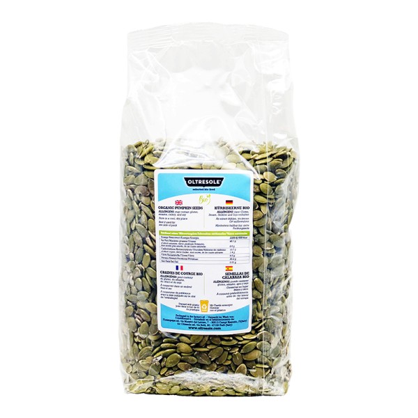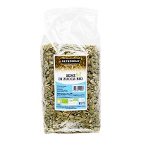 I Semi di Zucca BIO decorticati di Oltresole sono al naturale, non tostati e non salati, un ottimo snack salutare da consumare per merenda o prima dell'attività fisica per fornire all'organismo un'adeguata fonte di energia e alcune importanti sostanze nutritive. Si possono utilizzare i semi di zucca non soltanto come snack, ma anche per preparare diverse ricette: torte salate e dolci, pane e focacce, vellutate ed insalate miste. I semi di zucca sono ottimi per chi segue una dieta vegana, visto che possono essere utilizzati in granella o in scaglie sottili al posto dei formaggi. I semi di zucca biologici di Oltresole sono ricchi di vitamine e minerali come magnesio, zinco e selenio, per il benessere dell'organismo. L'elevato apporto energetico rende i semi di zucca Oltresole, lo spuntino ideale per gli atleti o per chi segue un regime alimentare specifico come i vegetariani o i vegani. I semi di zucca Oltresole sono già sgusciati e pronti da mangiare.